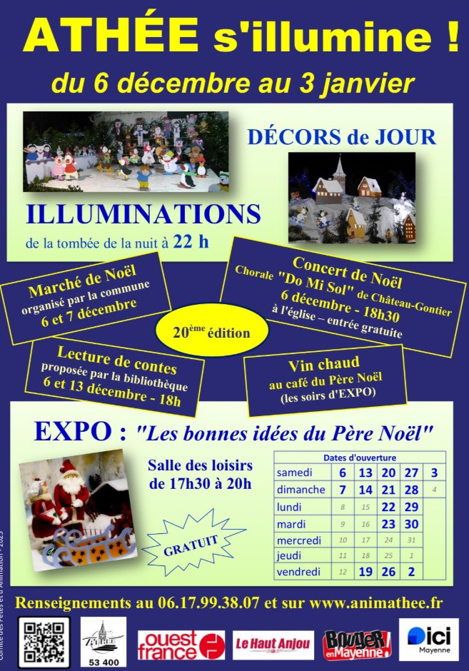 Comme chaque année depuis plus de 15 ans, grâce à de nombreux bénévoles, Athée - le village de la Noce 1900 - s’illuminera tous les soirs du 7 décembre au 4 janvier, jusqu'à 22h les vendredis, samedis, dimanches et jusqu'à 20h les autres soirs.